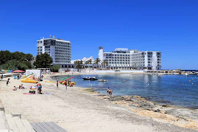 Neben Sand und Meer wird noch einiges mehr geboten, entlang des Strandes viele Bars. An der westlichen Flanke des Strands befindet sich der Beach Club „O Beach Ibiza“ und im Wasser ein angegliederter Wasserpark.